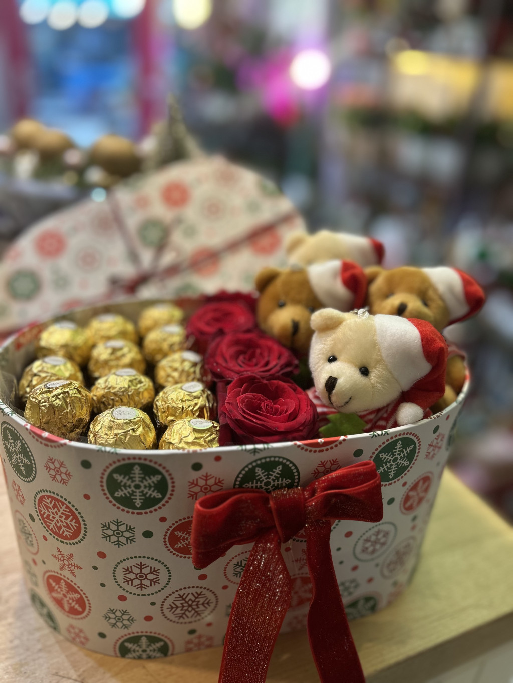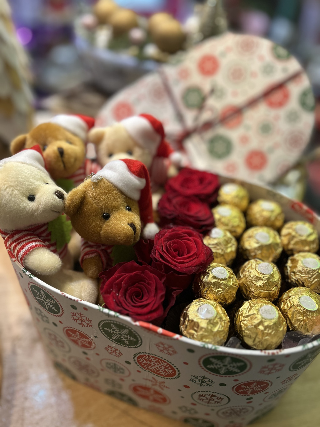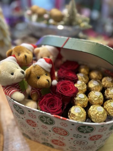 Mélypiros ecuadori rózsák, arany csokoládé, apró karácsonyi macik – minden benne van, ami egy ünnepi figyelmességet igazán széppé tesz.